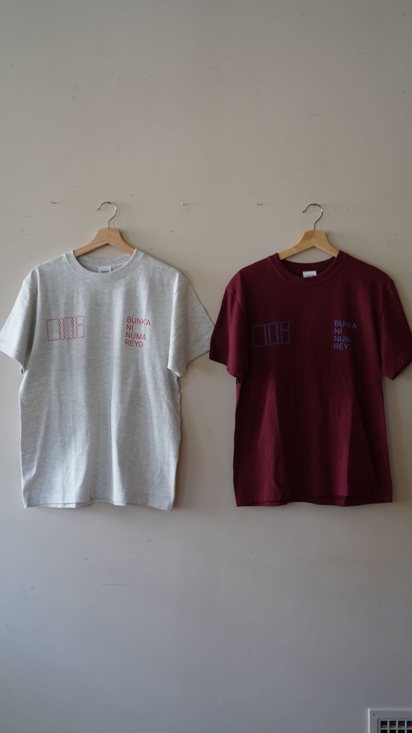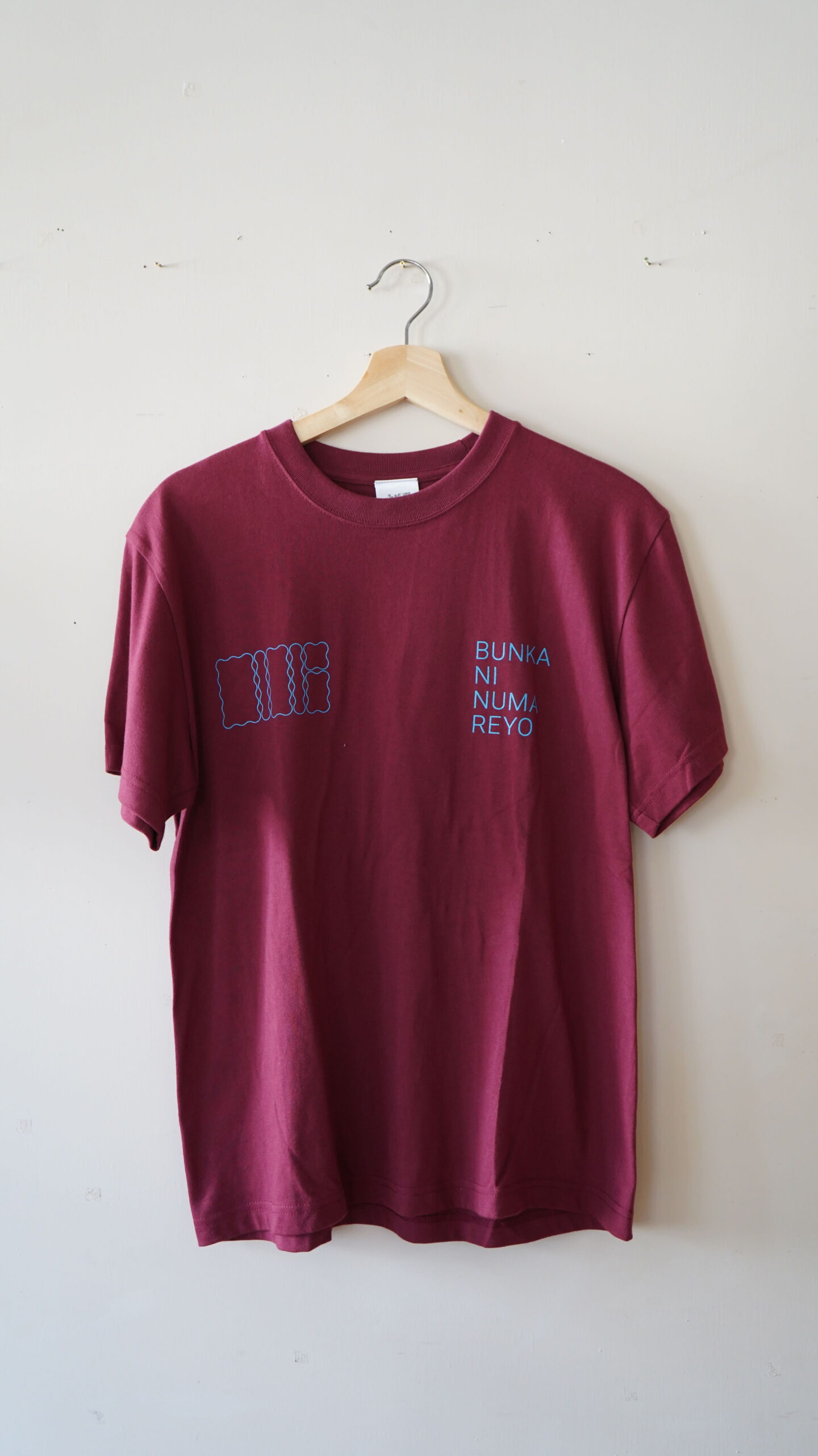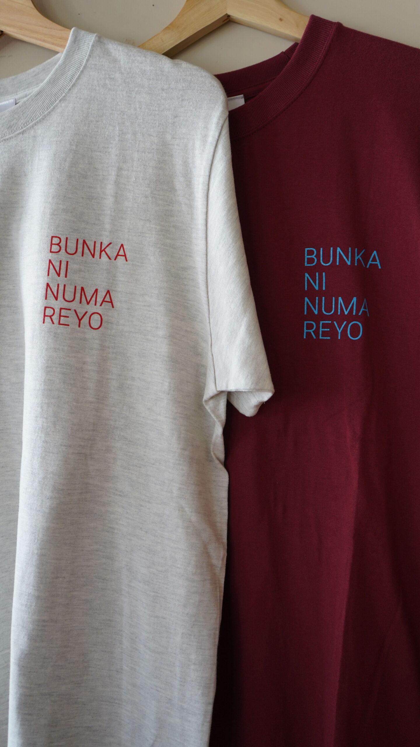 フロントの両サイドにロゴと「BUNKANI NUMAREYO」のフォントデザインがあしらわれているTシャツ。