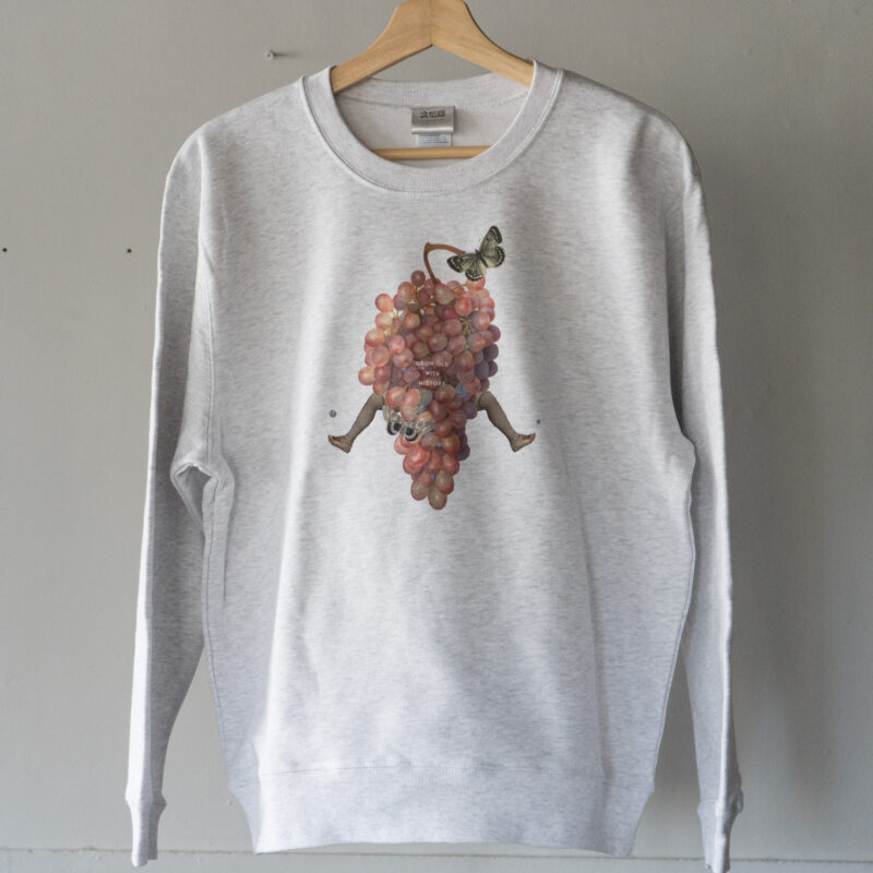 miyamotomanami個展 『GROW OLD WITH HISTORY』 の開催記念して作られた甲斐八珍果のGrape×Jewelryモチーフのコラージュをプリントしたスウェット。
