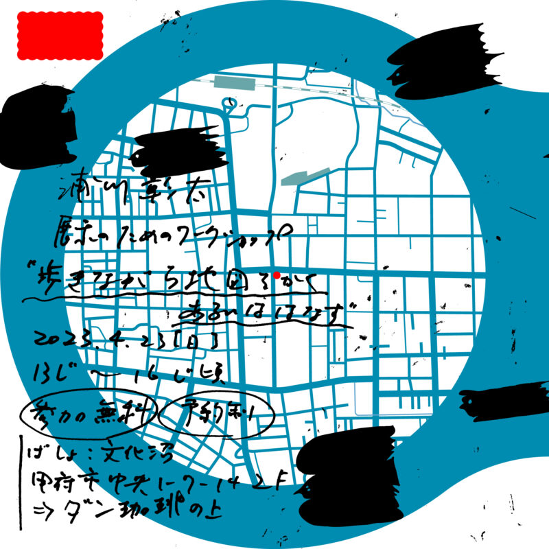 文化沼のオープン時に開催する浦川彰太さんの展示に先立ちまして、4/23(日)に甲府の街を歩いて、地図のようなポスターを作るワークショップを開催いたします。